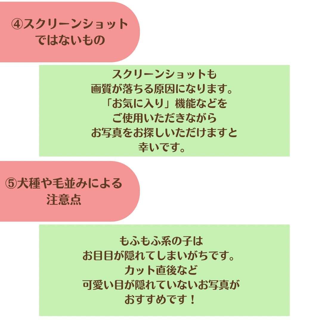 >>>モフモフ系のワンちゃんなど、目が隠れがちな子は、目がしっかりわかるお写真でお願いします!(カット後など)